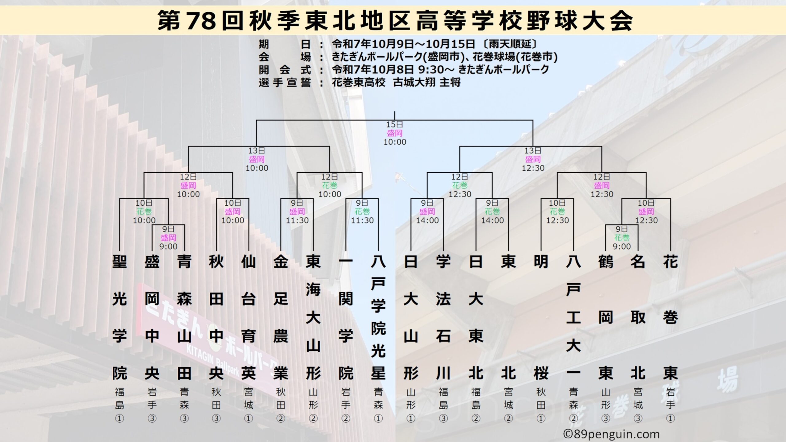 2025年度の大会結果秋の高校野球東北大会 組み合わせ決定 みちのくの強豪が岩手に集う 東北 - 高校野球秋の高校野球東北大会の組み合わせが決定!第1代表でみると聖光学院・仙台育英・八学...2025.10.01