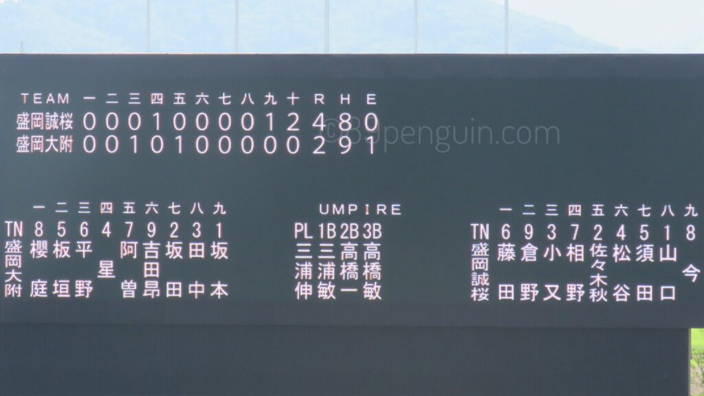盛岡地区予選の会場となっているきたぎんボールパークの開幕戦には盛岡誠桜と盛岡大附が登場。試合は1対2の盛附リードでむかえた9回表、誠桜は3番小又と4番関谷の連打で同点とし土壇場で試合を振り出しに戻します。そしてタイブレークに突入した延長10回、誠桜は無死1,2塁から8番山口の一打がタイムリーとなり、さらに犠牲フライなどでこの回2点を勝ち越し。盛附の先発・坂本は130球を超える力投をみせるも勝利に届かず。4対2で盛岡誠桜が激闘を制して代表毛停戦に駒を進めました。